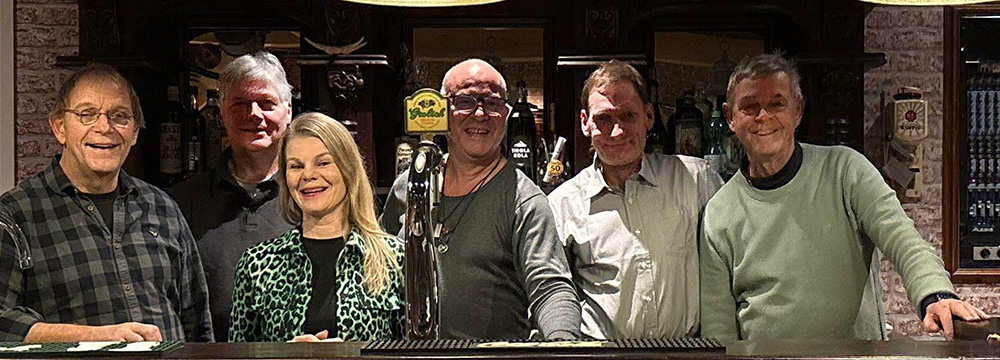 In de periode van 2023 tot eind 2024 hebben we met diverse muzikanten getracht om en band op poten te zitten, en helaas is dat niet gelukt. Toch waren de repetities met Alberto Tiehuis, Harry Kers, Rene Sleierink en Ruud Nijhuis best een plezier, maar uiteindelijk bleven Bert, Ruud en Erik over en moesten we op zoek naar weer nieuw talent. Dat werden Leon en Fabi als vocalisten, Dick op toetsen en uiteindelijk Rinus op slag. Leon stopte er mee in midden 2024 en Dick nam tijdens ons laatste optreden in het Huis van Katoen afscheid. Gelukkig kwam daar al snel een uitermate bekwame vervanger voor in de plaats , Fren-key. En die staat dan ook op de volgende foto.